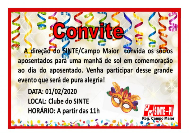 O SINTE-CAMPO MAIOR irá homenagear os aposentados e aposentadas da regional pela passagem do dia dos aposentados e pensionistas com uma grande manhã de sol para a categoria.