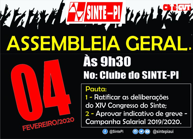 O SINTE-PI convoca todos os trabalhadores e trabalhadoras em educação para uma Assembleia Geral Extraordinária nesta terça-feira (04/02/2020), a partir das 9h30 no Clube do Sinte-PI, para discutir a campanha de valorização dos profissionais da ecuação básica públlica da rede estadual e aprovar o indicatio de greve.