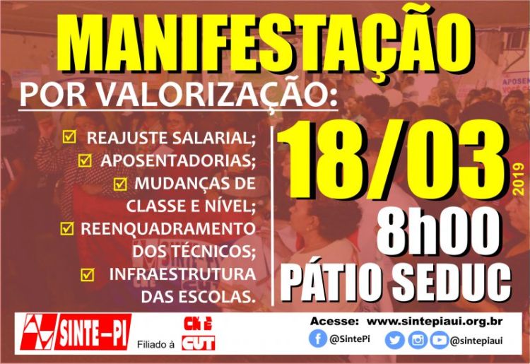 Os trabalhadores em educação realizam uma manifestação na próxima segunda-feira, dia 18/03, às 8h, no Pátio da Seduc exigindo valorização profissional da categoria.