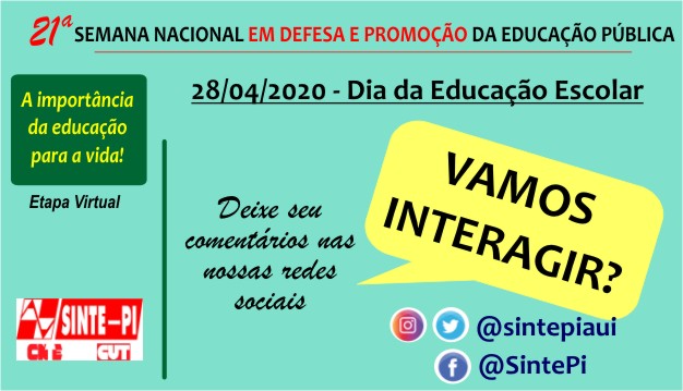 A 21ª Semana Nacional em Defesa e Promoção da Educação Pública, que teve início dia 23 e segue até 30 de abril, acontecendo de maneira virtual em atendimento às orientações dos órgãos de saúde em virtude do isolamento social decorrentes da pandemia do novo coronavírus (Covid-19).