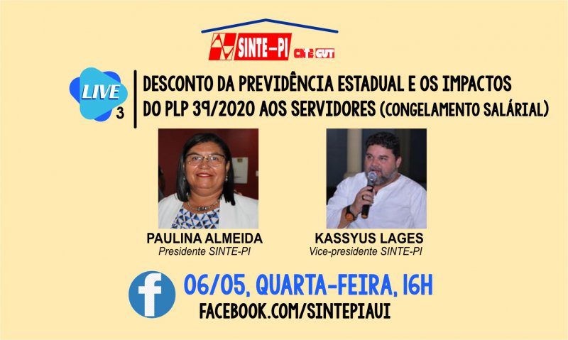 Nesta quarta-feira (06/05) o SINTE-PI vai conversar com a categoria sobre o Desconto da previdência dos aposentados da educação e sobre o PLP 39/2020, que congela o salário dos servidores públicos por 2 anos).