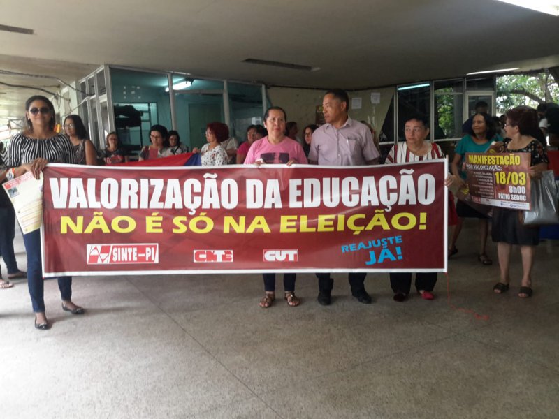 O SINTE-PI realizou na manhã desta segunda-feira (28) uma manifestação no Pátio da Secretária de Educação e Cultura do Estado (SEDUC-PI). Os servidores da educação reivindicam a valorização dos profissionais do Estado, pleiteando o reajuste salarial de 4,17%, aposentadoria da classe que apresenta processos em espera cerca de quatro anos, além da mudança de classe e de nível, reenquadramento dos técnicos e infraestrutura das escolas.