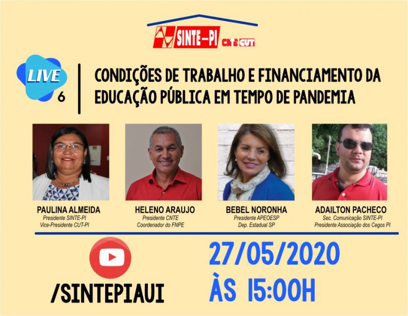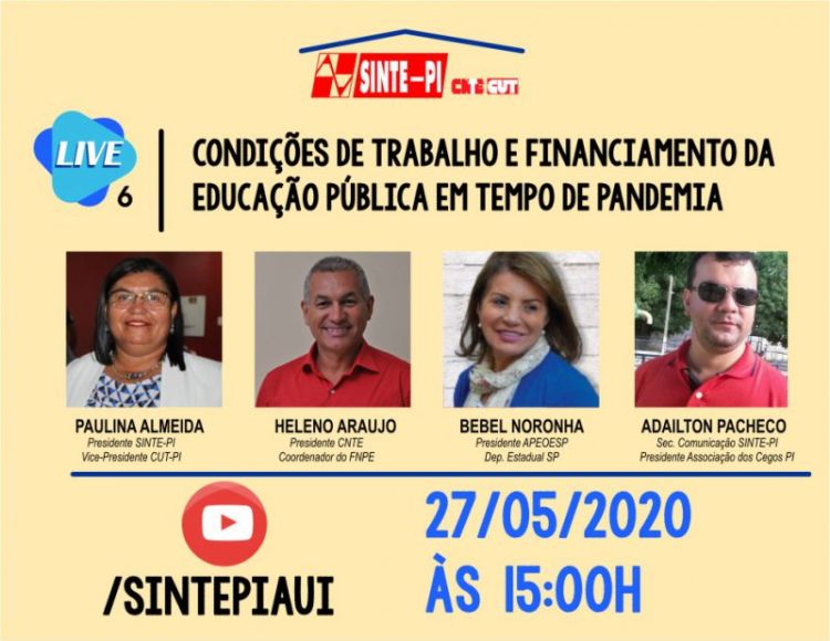 O Sinte Piauí promove nesta quarta-feira (27), a partir das 15h, mais uma transmissão ao vivo, aprofundando o debate envolvendo pautas da educação pública no contexto da crise sanitária da Covid-2020. Nesta sexta live, a presidente do Sinte Piauí, Paulina Almeida, recepciona, para o debate sobre "As condições de trabalho e o financiamento da educação pública em tempos de pandemia", o presidente da CNTE, Heleno Araújo, a presidente da APEOESP, Bebel Noronha e o secretário adjunto de Comunicação do Sinte Piaui, Adailton Pacheco.
