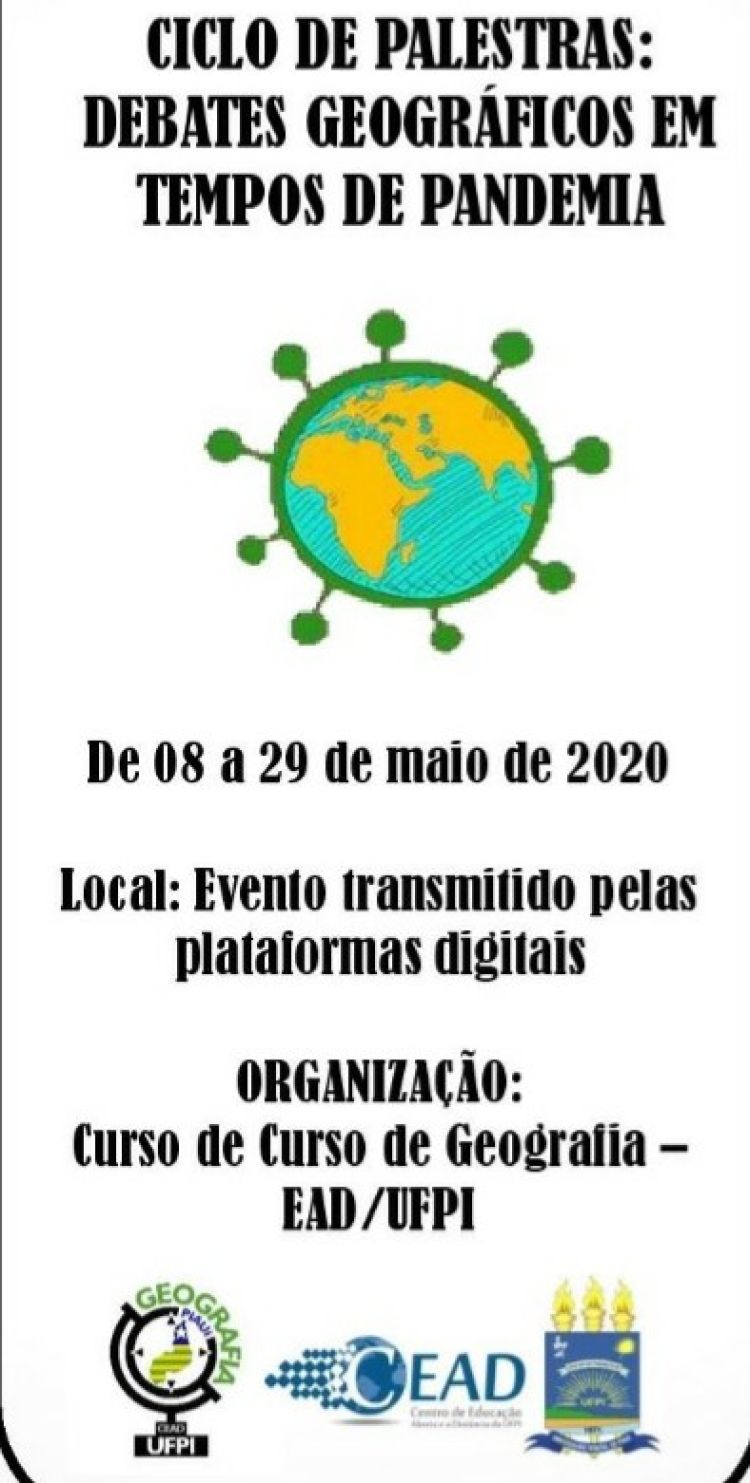 Nesta sexta-feira (29), em alusão ao Dia do Geógrafo, a Coordenação do Centro de Educação a Distância da UFPI-CEAD/UFPI do Curso de Licenciatura Plena em Geografia da Universidade Federal do Piauí finaliza, em grande estilo, o Ciclo de Palestra: Debates Geográficos em Tempo de Pandemia, promovido pelo CEAD/UFPI no período compreendido entre os dias de 8 a 29 de maio, desenvolvendo temas atuais comportando a geografia e os desafios no enfrentamento dos novos hábitos proporcionados pela pandemia e pós-pandemia.