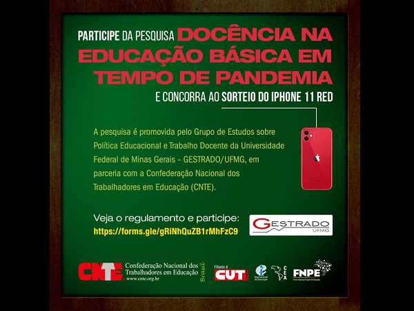 A CNTE convida professoras e professores para responder por completo ao questionário disponibilizado na plataforma Google com questões sobre as atividades que estão sendo desenvolvidas pelos(as) professores(as) neste período. Ao final das perguntas, veja as regras do sorteio do IPhone 11 Red.