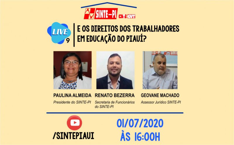 Nesta quarta-feira (1º/07) o encontro será às 16h pelo youtube.com/sintepiaui e terá como expositores, a presidente do Sinte-PI professora Paulina Almeida, secretário de funcionários do Sinte-PI Renato Bezerra e o assessor jurídico do Sinte-PI, o advogado Geovane Machado.