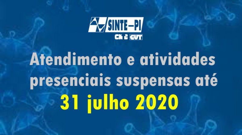 A direção do Sinte-PI, na defesa da integridade física e mental de seus associados, diretores e colaboradores, e seguindo ainda as recomendações das organizações e autoridades sanitárias sobre a proliferação da Covid-19, decidiu prorrogar a fechamento das suas estruturas físicas e atividades presenciais até 31 DE JULHO DE 2020, quando faremos nova avaliação do cenário da pandemia.