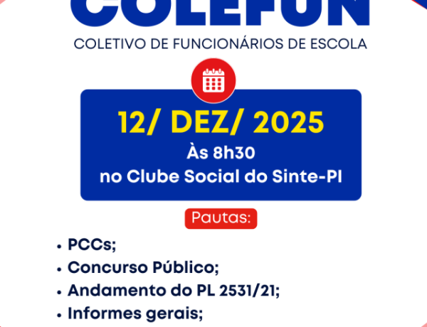 • Sinte-PI convoca reunião do Coletivo de Funcionários de escola para dia 12 de dezembro, às 8h30